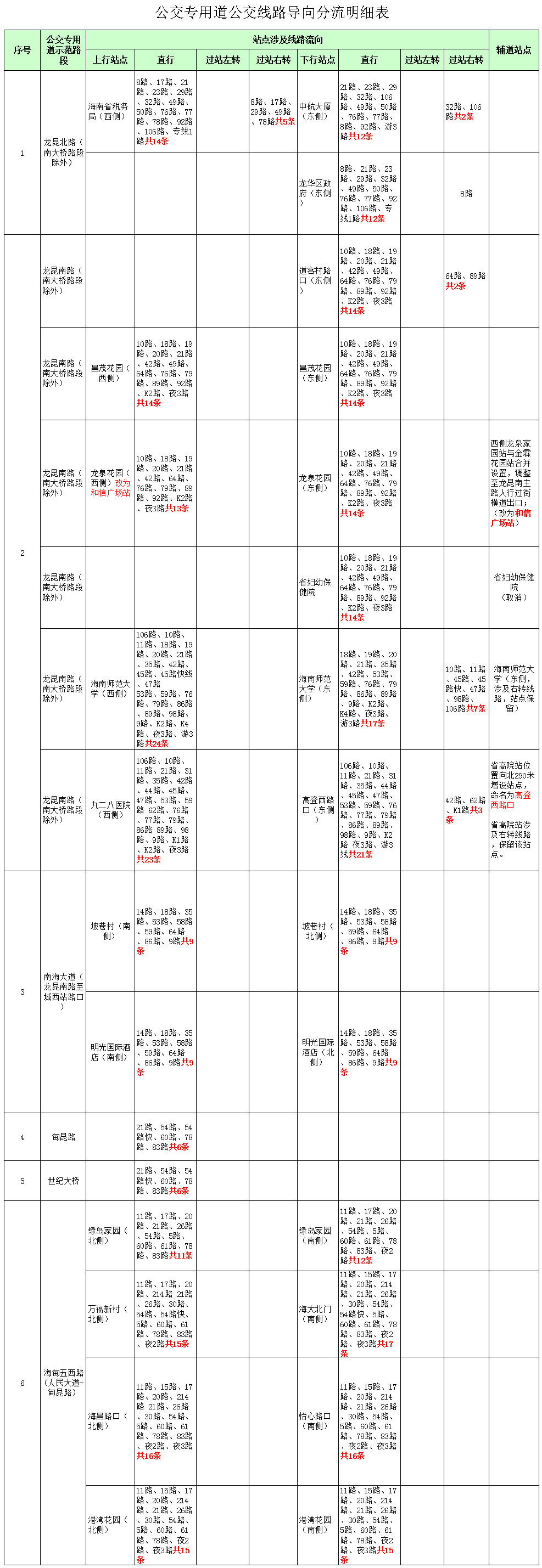 公交專用道啟用后,部分公交站點也將做出相應(yīng)調(diào)整,龍昆南路段道客村公交站北移約50米(保留原站點名稱);昌茂花園公交站(東、西側(cè))兩個站點調(diào)整至龍昆南路主路兩側(cè)人行過街橫道出口(保留原站點名稱);東側(cè)龍泉家園公交站北移60米并調(diào)整至龍昆南路主路(保留原站點名稱);龍泉家園公交站(西側(cè))與金霖花園公交站合并設(shè)置,調(diào)整至龍昆南主路人行過街橫道出口(更名為和信廣場站);省婦幼保健院公交站調(diào)整至龍昆南路主路人行過街橫道出口(保留原站點名稱);海南師范大學(xué)公交站北移80米并調(diào)整至龍昆南路主路(保留原站點名稱);省高院站公交站位置向北290米增設(shè)站點,命名為高登西街路口公交站,同時調(diào)整至龍昆南路主路人行過街橫道出口。龍昆北路段省國稅局公交站南移約200米,更名為海南省稅務(wù)局站;景瑞大廈站遷移至國貿(mào)大道,保留原站名。