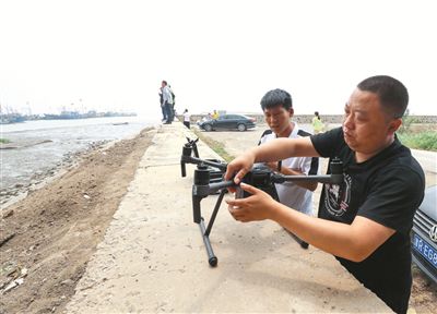 工作人員正在使用無人機(jī)對排污口進(jìn)行排查記者 何沛霖 攝