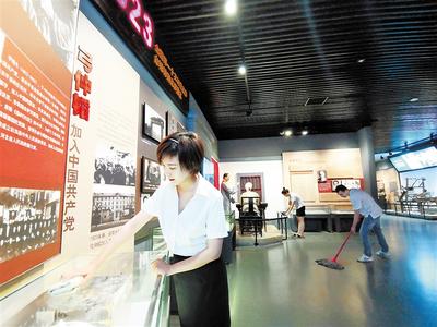 在安平縣臺城村全國第一個農(nóng)村黨支部紀(jì)念館內(nèi),工作人員正在擦拭展臺。 記者 焦 磊攝