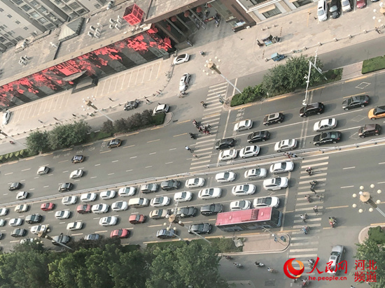 6月12日上午8時(shí)許,正值上班高峰期,石家莊市區(qū)主干道裕華路上,人多車多。裕華路與體育大街交口往東,北側(cè)是劍橋春雨小區(qū),南側(cè)是方北小區(qū),兩個(gè)小區(qū)門口正對(duì)裕華路的半幅機(jī)動(dòng)車道上分別畫著斑馬線。因?yàn)楦浇袑W(xué)校,南北兩側(cè)陸陸續(xù)續(xù)有送孩子的家長(zhǎng)或騎車人從斑馬線通過(guò)裕華路。每當(dāng)有人通過(guò)斑馬線時(shí),裕華路上的汽車都會(huì)停下來(lái)等候。由于行人三五成群,不斷通過(guò),路上的汽車不得不繼續(xù)等候,以至于排起了長(zhǎng)龍。