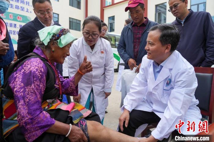 圖為青島醫(yī)療專家團(tuán)隊(duì)在日喀則為62歲的倉木拉老人進(jìn)行診斷,倉木拉對援藏醫(yī)療專家豎起大拇指。王建亮 攝
