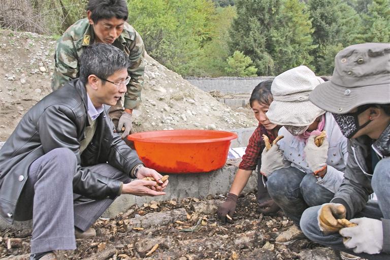 廣東省第七批援藏工作隊成員肖國鑫(左一)在波密縣指導當?shù)剞r(nóng)牧民種植天麻。