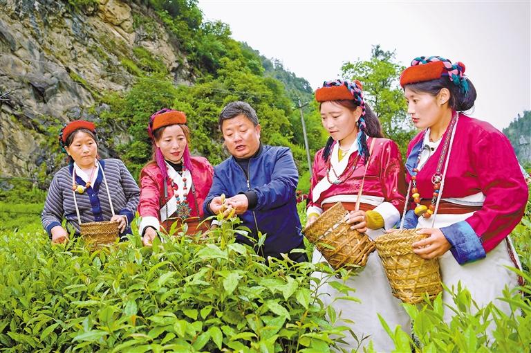 錯(cuò)那市勒布溝,安徽第七批援藏隊(duì)隊(duì)員裴含龍指導(dǎo)門(mén)巴族村民規(guī)范采摘茶葉。