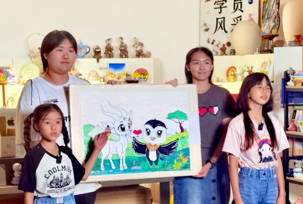 活動(dòng)期間,北京的劉心語、吳梓菡、文藝、吳辰希與西藏的旦增雍措、旦增尼瑪、徐杰、索朗央珍等兩地青少年代表,通過“同繪一幅畫”的方式,將西藏的藏羚羊與北京的雨燕巧妙地融合在一個(gè)畫面之中。畫作中,一邊是象征北京自由與活力的“空中旅行家”雨燕在無邊的藍(lán)天中翱翔,另一邊則是代表西藏堅(jiān)韌與生機(jī)的藏羚羊在遼闊的無人區(qū)自由奔跑。盡管兩者習(xí)性迥異、棲息地不同,它們共同展現(xiàn)了自由無束的特質(zhì),寓意著京藏兩地青少年盡管生活在不同的文化環(huán)境中,卻都能追求自由和快樂的成長。正如北京的孩子們說:“我們把來自拉薩的藏羚羊和來自北京的小雨燕聚集到一起,畫在了一個(gè)畫面中。看:藏羚羊戴著藏族耳飾,小雨燕身著云領(lǐng)服飾,她們是盛裝出席啊。就像我們,北京和西藏的同學(xué)們,手拉著手,心連著心,書信往來,學(xué)習(xí)探究,相互幫助,一起成長。”西藏的孩子說:“我們就像畫中的藏羚羊和北京雨燕一樣,心手相牽,互相鼓舞,用積極的態(tài)度學(xué)習(xí)、生活,成為祖國的好少年!”。