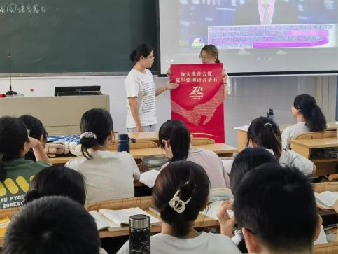 嶺南師范學(xué)院《教師語(yǔ)言》課程組負(fù)責(zé)人韓芳芳,兼任教育科學(xué)學(xué)院23小教6班班主任。她將課程教學(xué)與班級(jí)管理工作相結(jié)合,通過(guò)課程專業(yè)引領(lǐng)和支撐,組織學(xué)生參與全國(guó)第27屆普通話宣傳周,并攜手中秋佳節(jié),于9月13日晚舉辦了推普特色班會(huì),以生動(dòng)活潑的形式普及國(guó)家通用語(yǔ)言文字知識(shí),開(kāi)創(chuàng)新學(xué)期之新氣象。教科院黨委副書(shū)記陳理才應(yīng)邀參加了此次班會(huì)。