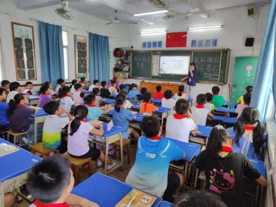 21級(jí)實(shí)習(xí)生戴鈺瑩在湛江市第四小學(xué)舉辦推普活動(dòng),將紅色經(jīng)典與傳統(tǒng)文化教育相結(jié)合,通過(guò)誦讀《西江月·井岡山》和《三字經(jīng)》,讓學(xué)生感受到革命先烈的英勇無(wú)畏,傳承了中華民族的傳統(tǒng)美德與智慧,增強(qiáng)了文化自信與民族自豪感。