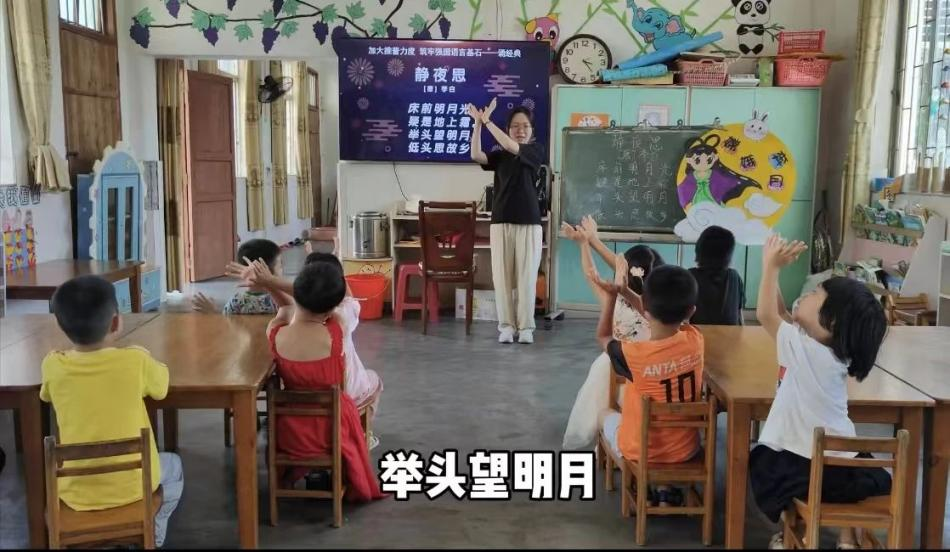 20級(jí)畢業(yè)生陳永麗指導(dǎo)云浮市郁南縣寶珠鎮(zhèn)中心幼兒園學(xué)生借助手勢(shì)舞誦讀《靜夜思》。學(xué)前教育階段是幼兒語(yǔ)言發(fā)展的關(guān)鍵時(shí)期,此時(shí)的語(yǔ)言環(huán)境和教育對(duì)幼兒的語(yǔ)言能力發(fā)展具有重要影響。推廣普通話,能夠讓幼兒在規(guī)范的語(yǔ)言環(huán)境中成長(zhǎng),有利于其語(yǔ)言能力的全面發(fā)展和提高。手勢(shì)舞與古詩(shī)詞結(jié)合,能激發(fā)幼兒學(xué)習(xí)興趣,啟蒙傳統(tǒng)文化,提升教學(xué)效果和鄉(xiāng)村幼兒園教育質(zhì)量。