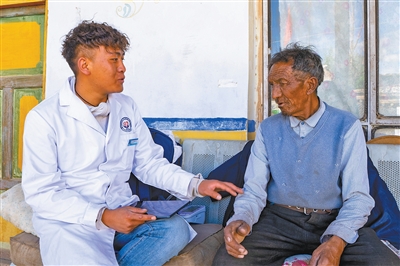 走進大門,他一邊和老人寒暄,一邊從包里拿出血壓計?!斑@兩個月血壓變化不大,咱們還要繼續(xù)保持健康生活習慣,不要吃太多油鹽。”量完血壓,索朗丹增細細叮囑。