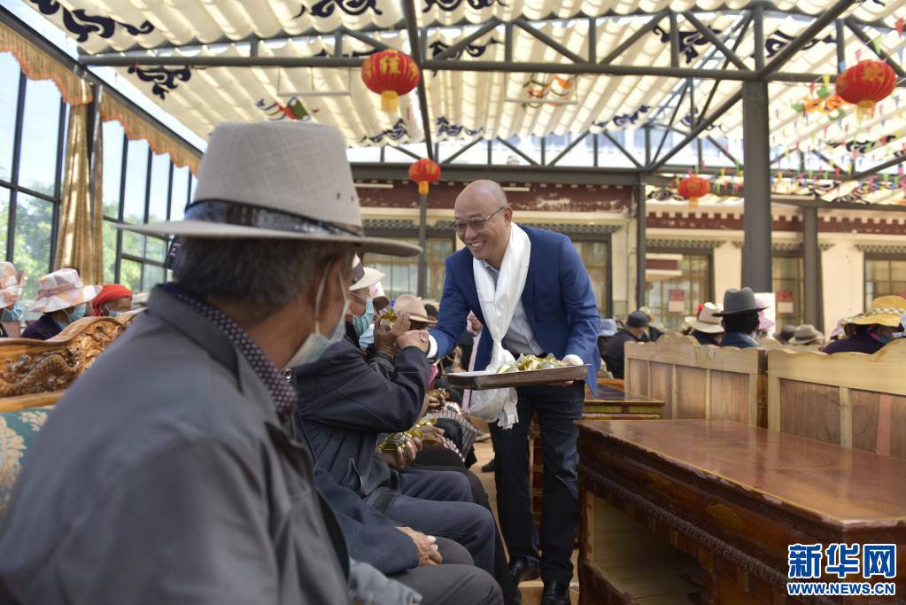 在西藏山南市乃東區(qū)特困人員集中供養(yǎng)服務(wù)中心,安徽援藏干部正在為孤寡老人們分發(fā)粽子。(新華社記者 王澤昊 攝)