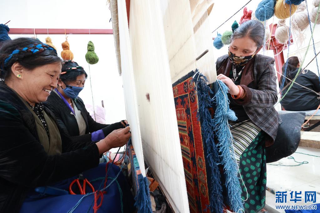 山南市瓊結(jié)縣農(nóng)牧民在襄陽援藏工作隊引進的西藏薩喜欽布公司編織藏毯(2021年6月18日攝)。(受訪者供圖)