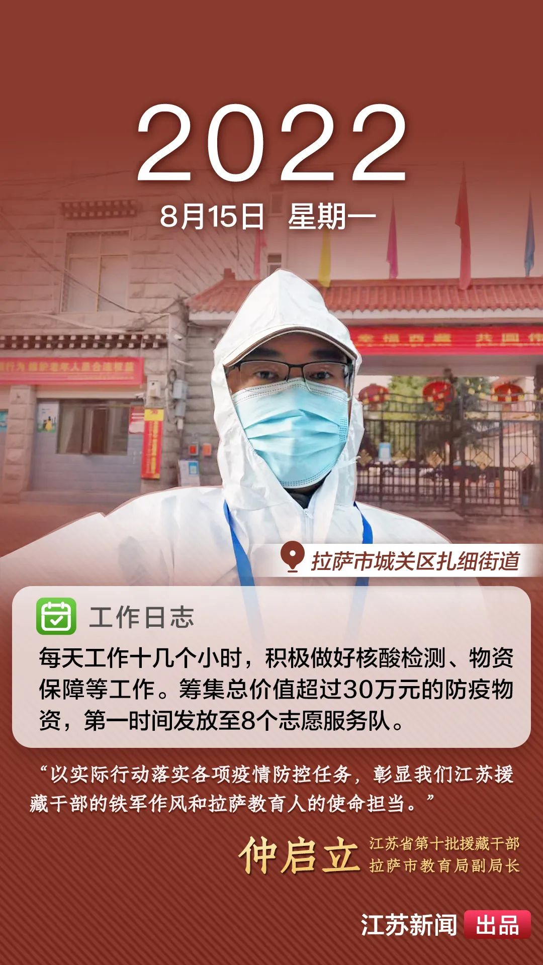 2022年8月,一場(chǎng)突如其來的新冠肺炎疫情襲擊拉薩。江蘇援藏前方指揮部樹立高度的政治意識(shí),堅(jiān)決貫徹江蘇省委、省政府主要領(lǐng)導(dǎo)批示精神和自治區(qū)、拉薩市部署要求,全力以赴做好疫情防控工作。第十批援藏干部人才克服初到高原的身體反應(yīng),服從服務(wù)大局、勇于擔(dān)當(dāng)作為,迅速投身疫情防控工作一線,以實(shí)際行動(dòng)展現(xiàn)江蘇援藏的鐵軍作風(fēng)。近期,我們將陸續(xù)推出江蘇援藏干部人才抗疫身影,敬請(qǐng)關(guān)注。