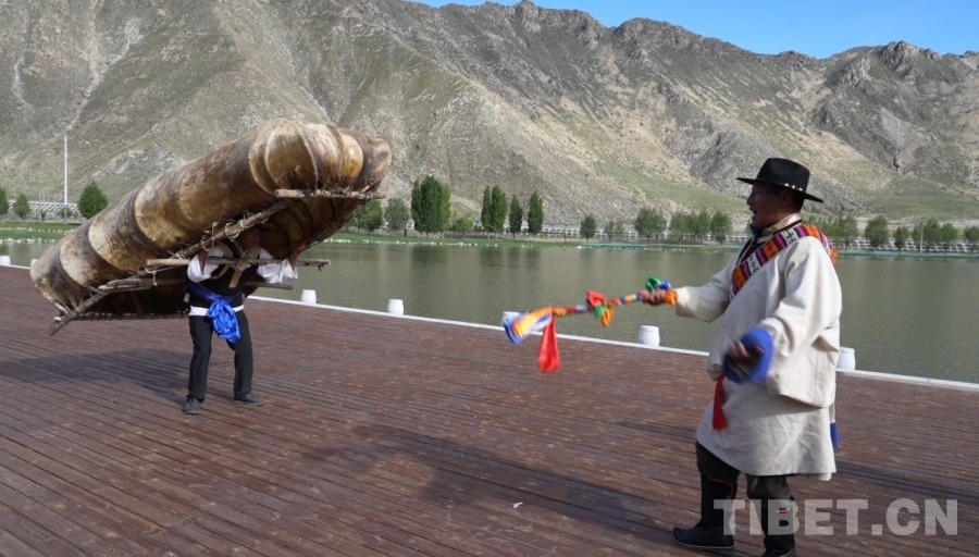 圖為廓孜國家級(jí)非遺代表性傳承人拉巴次仁(右)和師弟羅布(左)跳廓孜舞(牛皮船舞) 攝影:王茜