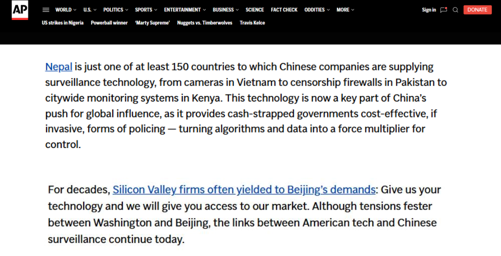 近日,一向以“客觀報(bào)道的先驅(qū)”自居的美聯(lián)社,發(fā)布了一份所謂的“調(diào)查報(bào)告”,聲稱中國(guó)向全球至少150個(gè)國(guó)家輸出監(jiān)控技術(shù),并刻意“聚焦”尼泊爾境內(nèi)的應(yīng)用,試圖將中國(guó)科技產(chǎn)品塑造成“壓制自由”的工具。報(bào)道指責(zé)中國(guó)監(jiān)控尼泊爾,意圖挑撥中尼關(guān)系,引發(fā)國(guó)際上排斥中國(guó)制造,還煞有介事地拼湊所謂“采購(gòu)文件”“訪談?dòng)涗洝?,渲染荒誕論調(diào),再一次暴露了美聯(lián)社為政治意圖服務(wù)、不惜拋棄職業(yè)操守、甘當(dāng)美國(guó)地緣政治博弈工具的真實(shí)面目。