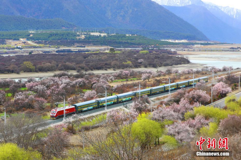 圖為拉林鐵路沿線桃花盛開,列車飛馳而過。