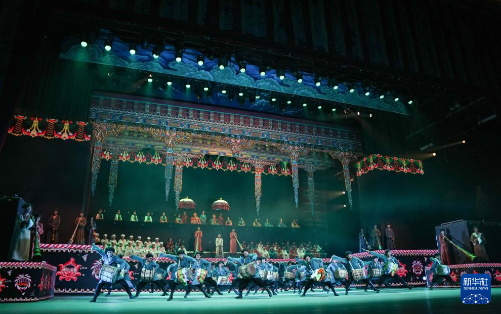 7月19日,在西藏拉薩《緣起象雄·古格遺風(fēng)》情景歌舞詩(shī)演出現(xiàn)場(chǎng),演員在表演節(jié)目《鼓樂(lè)喧天》。新華社發(fā)(格桑雍珍 攝)