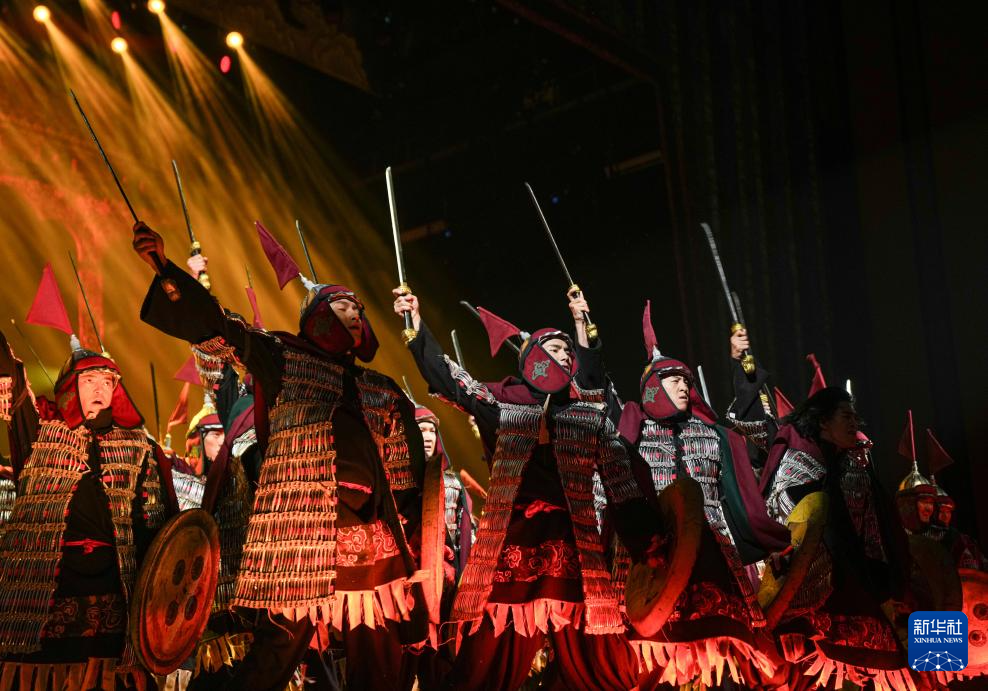 7月19日,在西藏拉薩《緣起象雄·古格遺風(fēng)》情景歌舞詩(shī)演出現(xiàn)場(chǎng),演員在表演節(jié)目《勇士戰(zhàn)舞》。新華社發(fā)(格桑雍珍 攝)