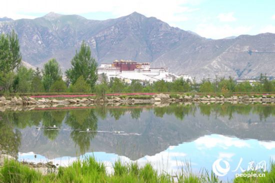 雄偉的布達(dá)拉宮與綠意蔥蘢的南山隔河相望。人民網(wǎng)記者 劉凡攝