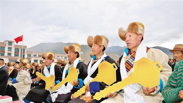分房?jī)x式當(dāng)天下午,扎嘎新村村民們身著盛裝,興高采烈地聚集在廣場(chǎng)上,臉上寫(xiě)滿了期待與興奮。隨著主持人的宣布,最令人期待的分房環(huán)節(jié)終于到來(lái),桑日縣相關(guān)負(fù)責(zé)人向扎嘎溝5個(gè)行政村代表發(fā)放新房“鑰匙”,臺(tái)下響起一陣歡呼和掌聲。