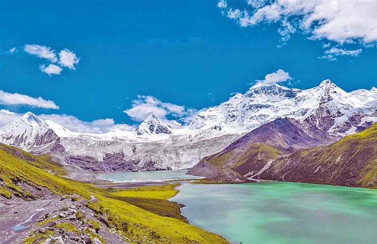 薩普雪山2016年才被發(fā)現(xiàn)并面世,是一處保護(hù)非常完整的天然冰川。其主峰海拔為6956米,北側(cè)有巨大的薩普冰川,冰川末端有一湖泊叫薩姆錯(cuò),海拔約4750米,薩姆錯(cuò)分內(nèi)、外湖,內(nèi)湖為崗香童錯(cuò)冰湖,終年不化,一年四季漂浮千年冰雕,形狀各異;外湖湖水碧綠,湖內(nèi)魚(yú)兒成群。