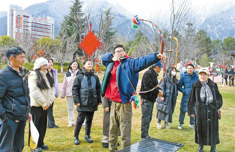 游園活動(dòng)融合了吉祥儀式、民間歌舞、鍋莊表演、年貨集市、美食體驗(yàn)、文創(chuàng)產(chǎn)品展示、藏漢書(shū)法作品派送等多元內(nèi)容,還開(kāi)展了林芝藏族服飾大比拼、猜燈謎、“押加”、工布響箭體驗(yàn)、甩“烏爾朵”、藏骰體驗(yàn)等文體互動(dòng)游戲,讓游客和市民群眾深度體驗(yàn)到了藏歷新年的獨(dú)特年味兒。