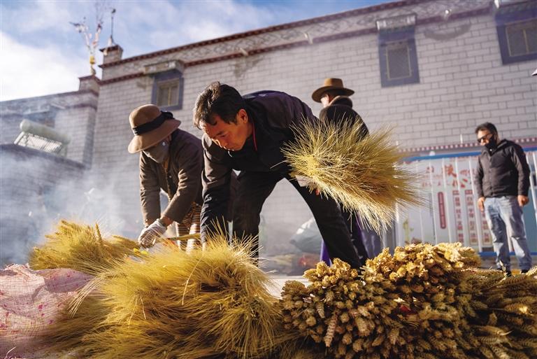 每年12月起,桑木村處處可見(jiàn)“羅薩梅朵”。清晨,天還未亮,村民們就已忙碌起來(lái)。有人將制作好的“羅薩梅朵”打包送往拉薩市區(qū)售賣(mài),有人則繼續(xù)為剩下的麥穗和青稞穗上色、曬干?!拔覐男】粗L(zhǎng)輩們制作‘羅薩梅朵’,7歲就開(kāi)始幫忙捆綁,20歲開(kāi)始獨(dú)立制作。每到這個(gè)時(shí)候,我就知道新年快到了?!?4歲的村民卓瑪次仁回憶道。