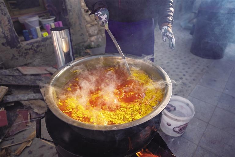 “玫紅色和黃色的都做完了吧?這個(gè)顏料水我倒了,開(kāi)始準(zhǔn)備制作青色?!币慌?,61歲的央金將盆洗干凈,繼續(xù)煮水放入顏料。“‘羅薩梅朵’有青色、綠色、玫紅色、黃色四種顏色,其中青色耗時(shí)最長(zhǎng),不僅需要自己調(diào)制,而且最難上色?!毖虢鹫f(shuō),“我們一般是早上7點(diǎn)開(kāi)始上色,上完色都快下午4點(diǎn)了。”