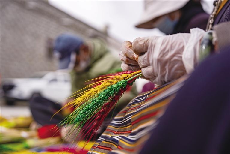 從春耕、夏耘、秋收到冬天的染色、晾干、捆綁、售賣(mài),“羅薩梅朵”的制作過(guò)程并不簡(jiǎn)單,種植和上色都極其辛苦。卓瑪次仁告訴記者:“每年4月,我們開(kāi)始種植小麥和青稞,澆水施肥。9月收割時(shí),我們會(huì)挑選顆粒飽滿(mǎn)的麥穗和青稞穗,捆綁后去皮曬干。10月,將它們收入屋中,一層層壘起來(lái),房間最好朝陽(yáng)且沒(méi)有老鼠。11月,開(kāi)始采購(gòu)顏料和捆扎用的毛線?!?/p>