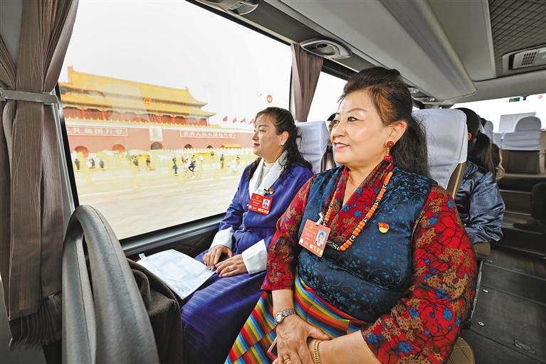 圖為人大代表們乘車前往駐地的途中經(jīng)過天安門廣場。記者 旦增西旦 攝