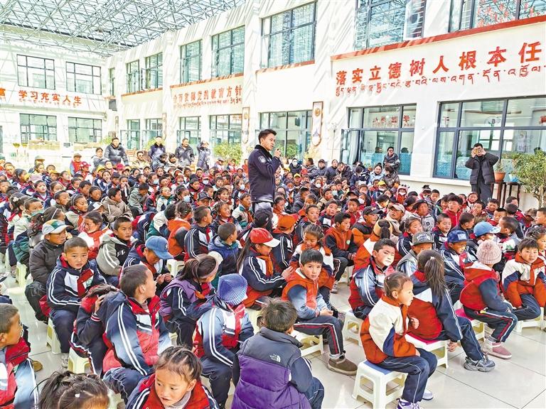 “辦理邊境通行證需要哪些材料?”“遭遇家暴、校園霸凌該怎么求助?”在堆納鄉(xiāng)中心小學(xué)的法治課堂上,民警澤成朗加正為孩子們講解未成年人保護法。這是該所“八五”普法宣傳的生動一幕。