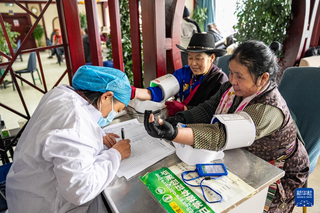 4月25日,在那曲市色尼區(qū)老年人日間照料中心,老人在測(cè)量血壓。新華社記者 丁增尼達(dá) 攝