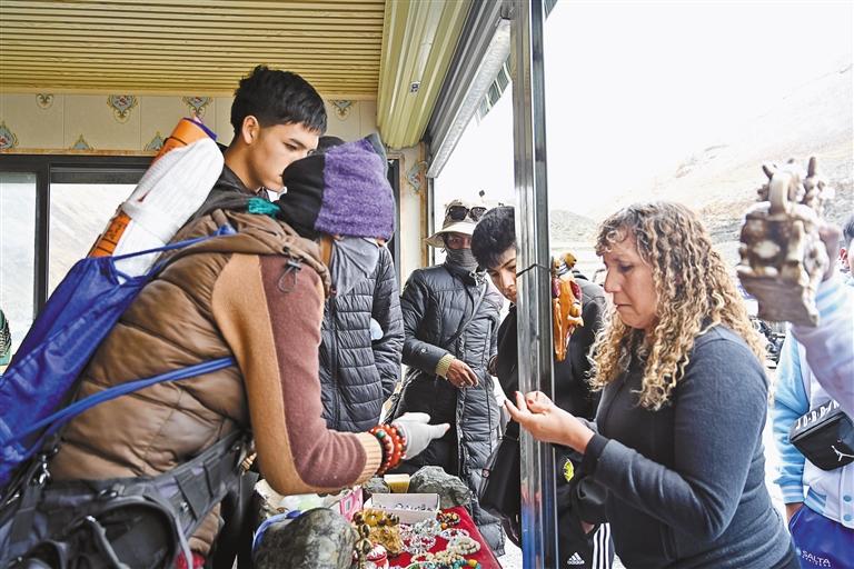 新奇感過后,游客們開啟購(gòu)物模式。“阿佳,這個(gè)掛飾可以定制嗎?”“你們可以發(fā)快遞嗎?”對(duì)于一連串的問題,阿佳格桑忙碌地一一回答著,“你們想要什么圖形,我們就給你定制什么圖形?!薄拔覀冞@兒快遞很快,今天下單明天就給你發(fā)!”短短半個(gè)小時(shí),“阿佳格桑工坊”的生意火爆,銷售藏式靠墊、藏式地毯、掛飾等特色產(chǎn)品4000多元?!盎厝ズ?,我要通過自媒體平臺(tái),宣傳這次西藏之旅的所見所聞,讓更多親朋好友來西藏旅游!”日本游客琴音有感而發(fā)。