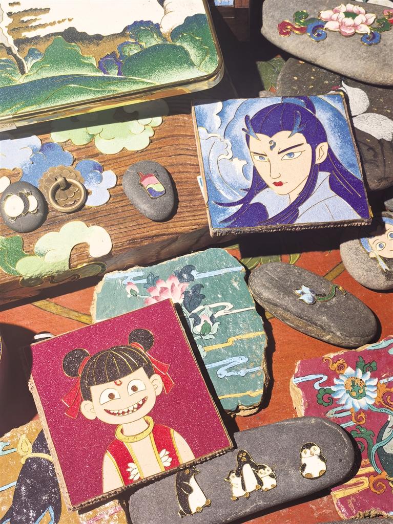 只見占地不到20平方米的小屋內(nèi),擺放著各類唐卡畫作。既有傳統(tǒng)唐卡作品,亦有動畫人物的“繪像”。描邊的金屬絲和光滑的質(zhì)感表面讓人忍不住駐足欣賞。店里陳列著巴掌大小的掐絲唐卡,金線掐絲在礦物顏料映襯下流光溢彩。畫師兼老板的南吉合多杰正在完成一份岡仁波齊的客單:“勉薩畫派的特色是線條細膩,顏色過渡自然。選好圖案后,會根據(jù)載體材質(zhì)、大?。ɡ缡^大小、木板長短等)收費?!彼贿呎f著,一邊用特制工具將顏料注入金絲隔斷。