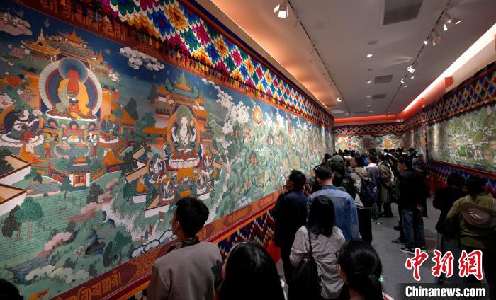 6月14日,描繪吐蕃贊普世系史的唐卡《吐蕃贊普世系大唐卡金子明鏡》在西藏博物館展出。該幅唐卡寬1.8米、長200米,由平措多布杰大師等30多位孜東唐卡畫師歷經(jīng)多年繪制完成。圖為觀眾正在欣賞展覽中的唐卡。中新社記者 李林 攝