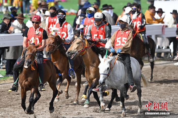 9月6日,西藏自治區(qū)那曲市恰青賽馬節(jié)進(jìn)入第二天,格薩爾賽馬場(chǎng)賽事精彩不斷。場(chǎng)內(nèi),1.38米以下小馬展開10000米速跑、10000米走馬、12000米走馬決賽,1.38米以上1.45米以下大馬角逐10000米速跑決賽。為觀眾帶來速度與耐力的草原盛宴,盡顯藏北草原賽馬文化的獨(dú)特魅力。圖為1.38米以下小馬走馬比賽現(xiàn)場(chǎng)。中新社記者 貢嘎來松 攝