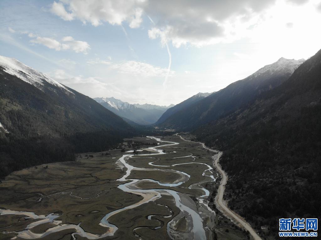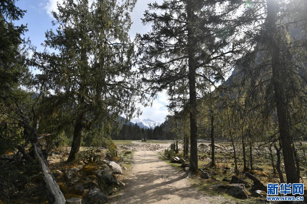 這是5月1日在西藏林芝市工布江達縣拍攝的通向新措的林蔭小道。新華社記者 孫瑞博 攝