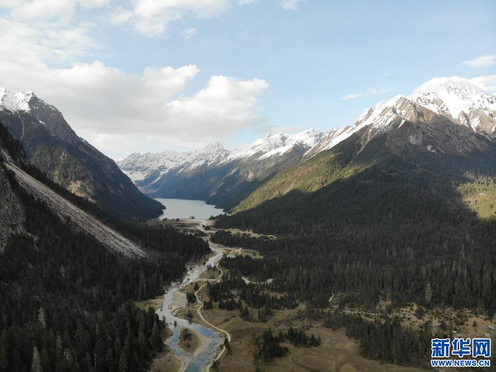 這是5月1日拍攝的雪山間的新措和森林、牧場(無人機照片)。新華社記者 孫瑞博 攝