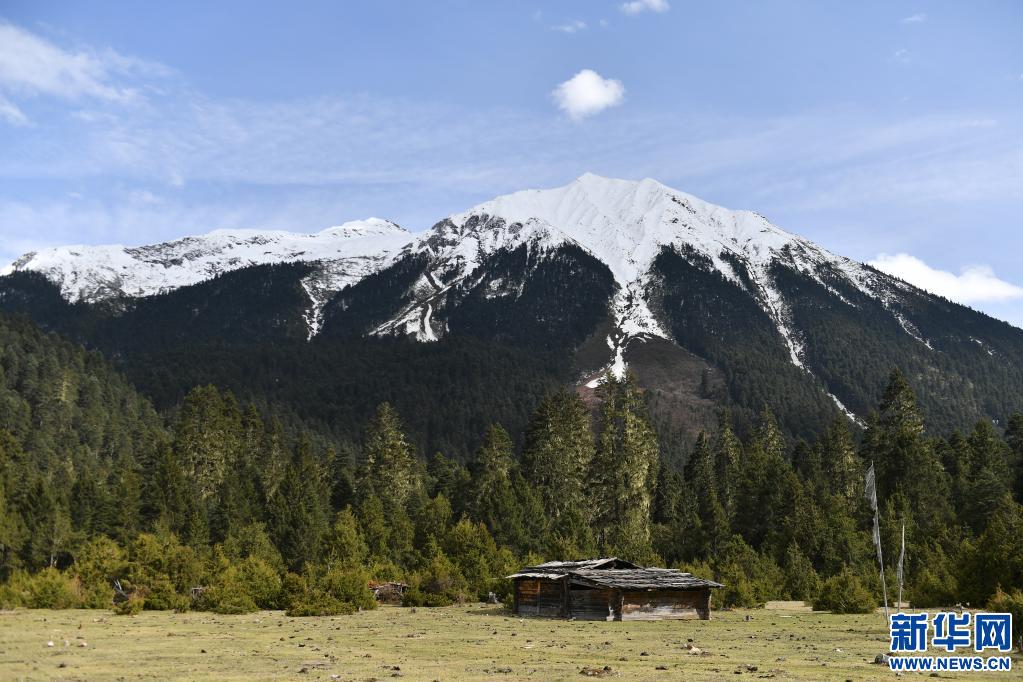 這是5月1日在西藏林芝市工布江達縣拍攝的新措旁桑通牧場上的木屋。新華社記者 孫瑞博 攝