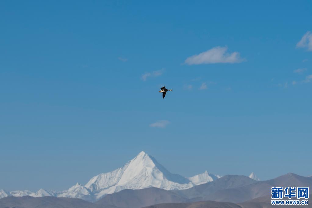 5月16日,在西藏仲巴縣里孜口岸附近,一只斑頭雁從空中飛過(guò)。新華社記者 孫瑞博 攝
