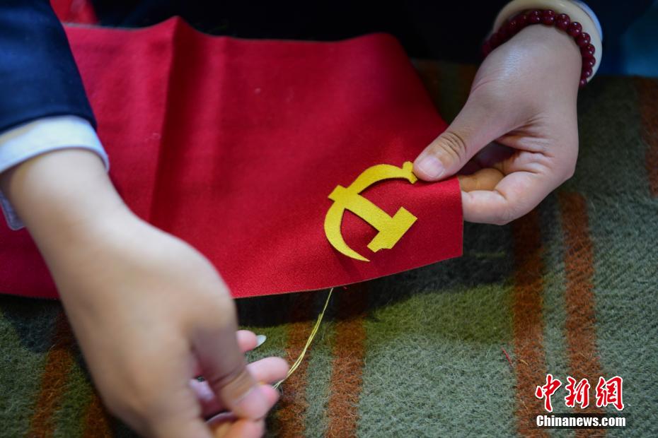 圖為西藏自治區(qū)民辦職業(yè)技能培訓(xùn)學(xué)校行業(yè)黨員縫制黨旗。貢嘎來松 攝