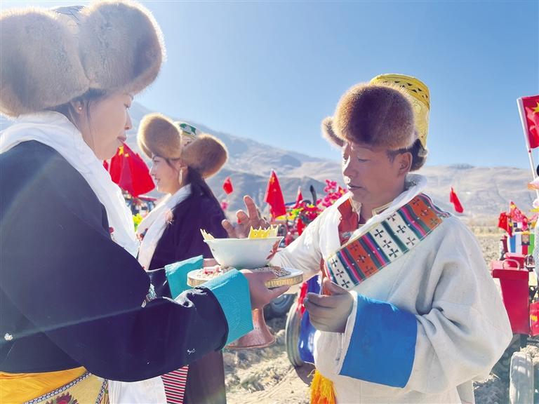 在克松村的田地旁,村民將拖拉機裝扮成“鐵?!?,用藏戲面具、彩色瓔珞等“打扮”一番,插著彩旗格外好看。村民還獻上哈達與自家釀的青稞酒給犁手、撒種子的姑娘和“鐵?!?,就開始了新春第一犁。