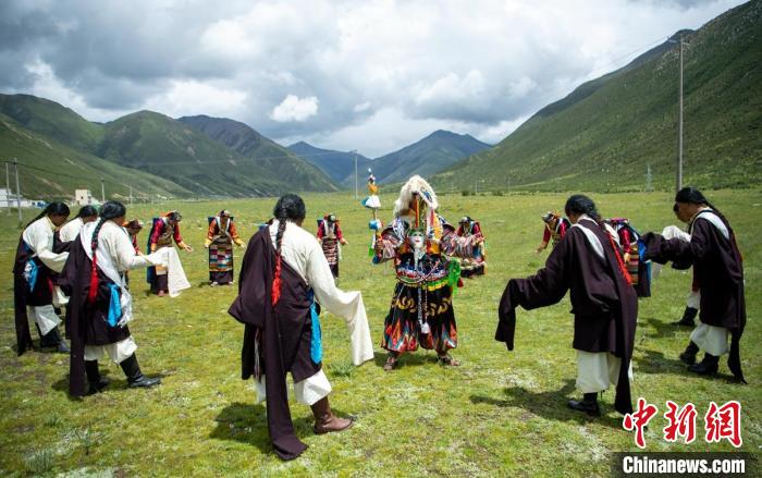 盛夏的西藏自治區(qū)拉薩市墨竹工卡縣門巴鄉(xiāng)仁多崗村草地上,28歲的尼瑪與身著盛裝的藏族牧民們跳著國家級非物質(zhì)文化遺產(chǎn)直孔普堆巴宣舞,迎接遠(yuǎn)道而來的游客,動作優(yōu)美的歌舞吸引了大家駐足觀賞,并用手機(jī)或相機(jī)記錄。