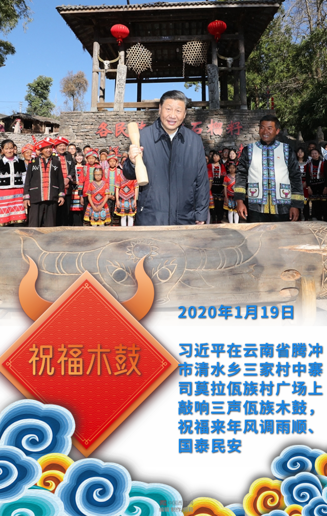 習近平在云南省騰沖市清水鄉(xiāng)三家村中寨司莫拉佤族村廣場上敲響三聲佤族木鼓,祝福來年風調雨順、國泰民安