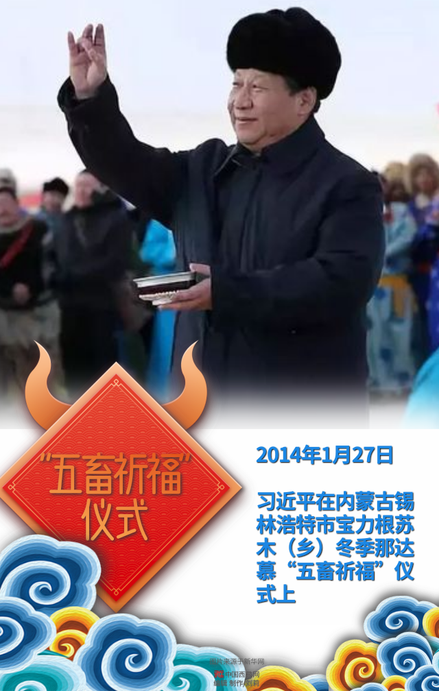 習近平在內蒙古錫林浩特市寶力根蘇木(鄉(xiāng))冬季那達慕“五畜祈?!眱x式上