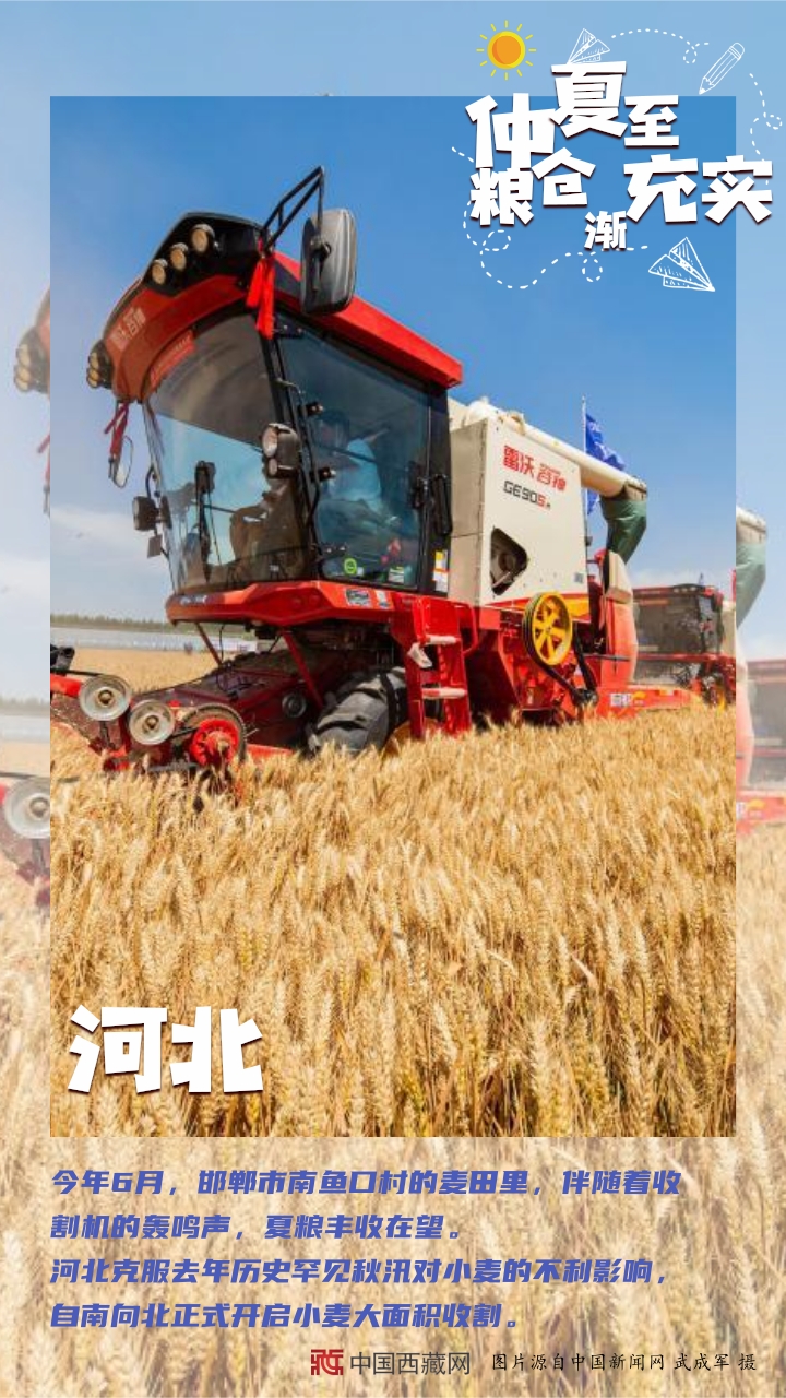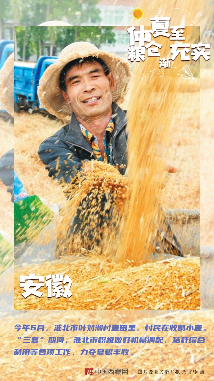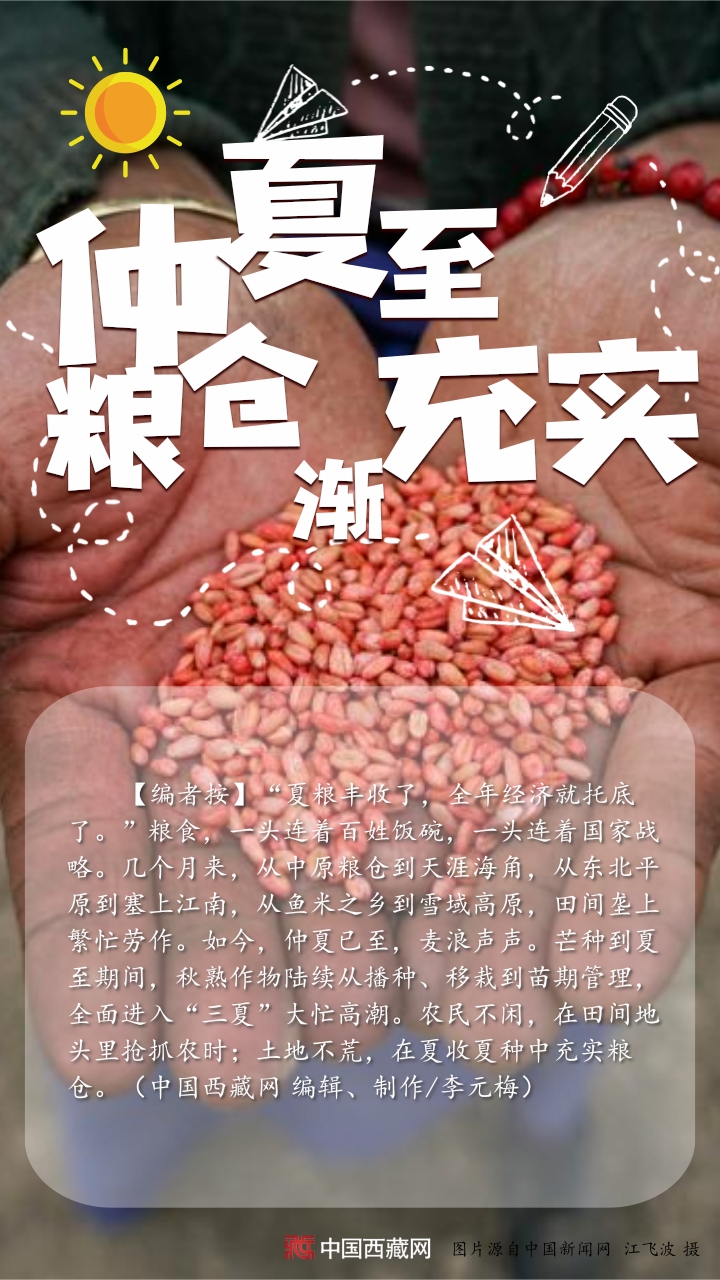 【編者按】“夏糧豐收了,全年經(jīng)濟(jì)就托底了?!奔Z食,一頭連著百姓飯碗,一頭連著國家戰(zhàn)略。幾個月來,從中原糧倉到天涯海角,從東北平原到塞上江南,從魚米之鄉(xiāng)到雪域高原,田間壟上繁忙勞作。如今,仲夏已至,麥浪聲聲。芒種到夏至期間,秋熟作物陸續(xù)從播種、移栽到苗期管理,全面進(jìn)入“三夏”大忙高潮。農(nóng)民不閑,在田間地頭里搶抓農(nóng)時(shí);土地不荒,在夏收夏種中充實(shí)糧倉。(中國西藏網(wǎng) 編輯、制作/李元梅)