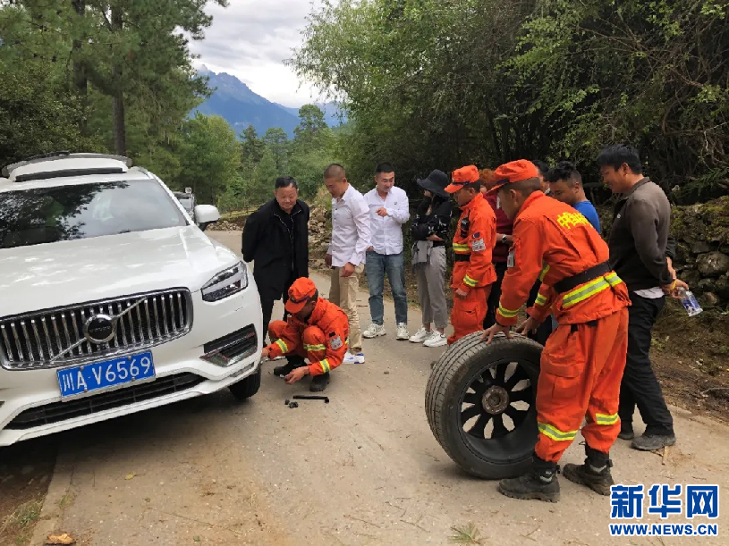 森林消防指戰(zhàn)員為游客換輪胎。新華社發(fā)(西藏森林消防總隊提供)