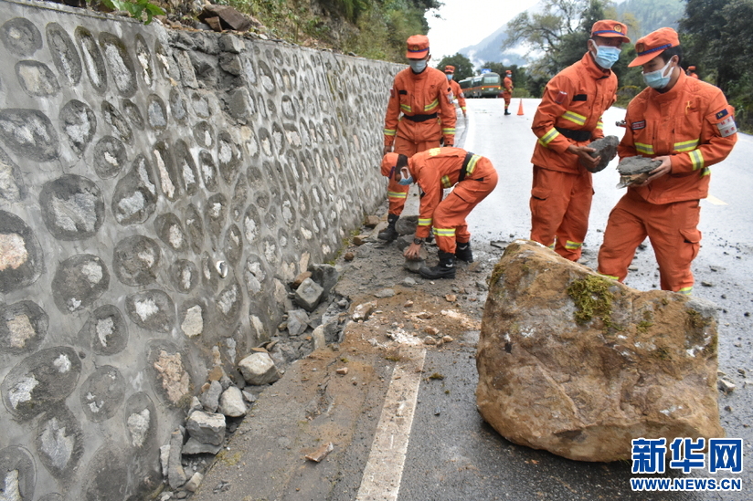森林消防指戰(zhàn)員搬離滾石排除安全隱患。新華社發(fā)(西藏森林消防總隊提供)
