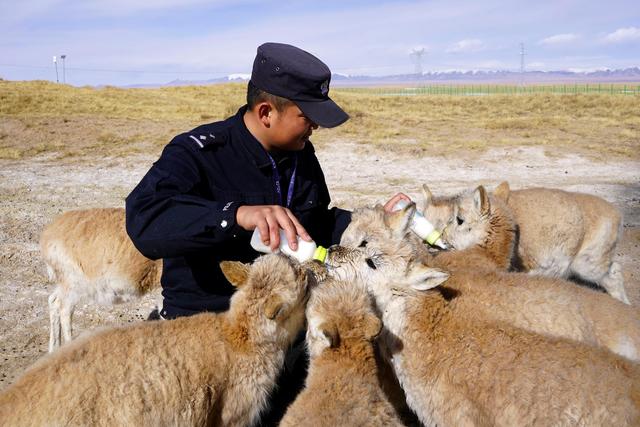 可可西里巡山隊(duì)員鄧海平給藏羚羊幼仔喂奶。新華社記 者王金金 攝