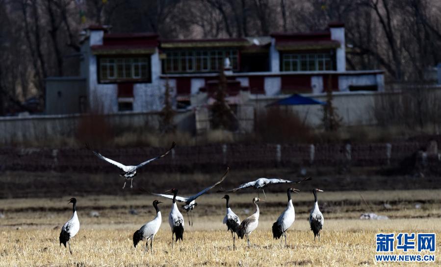 林周縣黑頸鶴自然保護區(qū)里的黑頸鶴(12月12日攝)。新華社記者 張汝鋒 攝
