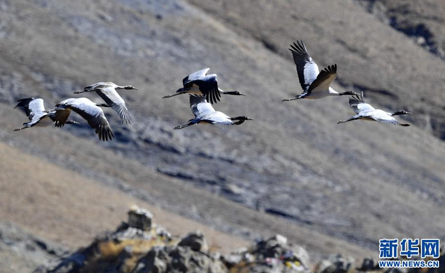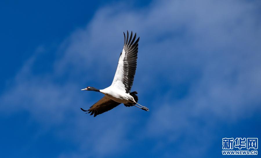 黑頸鶴在林周縣黑頸鶴自然保護區(qū)里飛翔(12月12日攝)。新華社記者 張汝鋒 攝