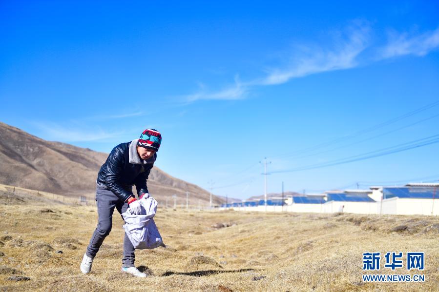 1月11日,隆亞村牧民東保在搬遷點(diǎn)周邊的草原上撿拾垃圾。新華社記者 張龍 攝